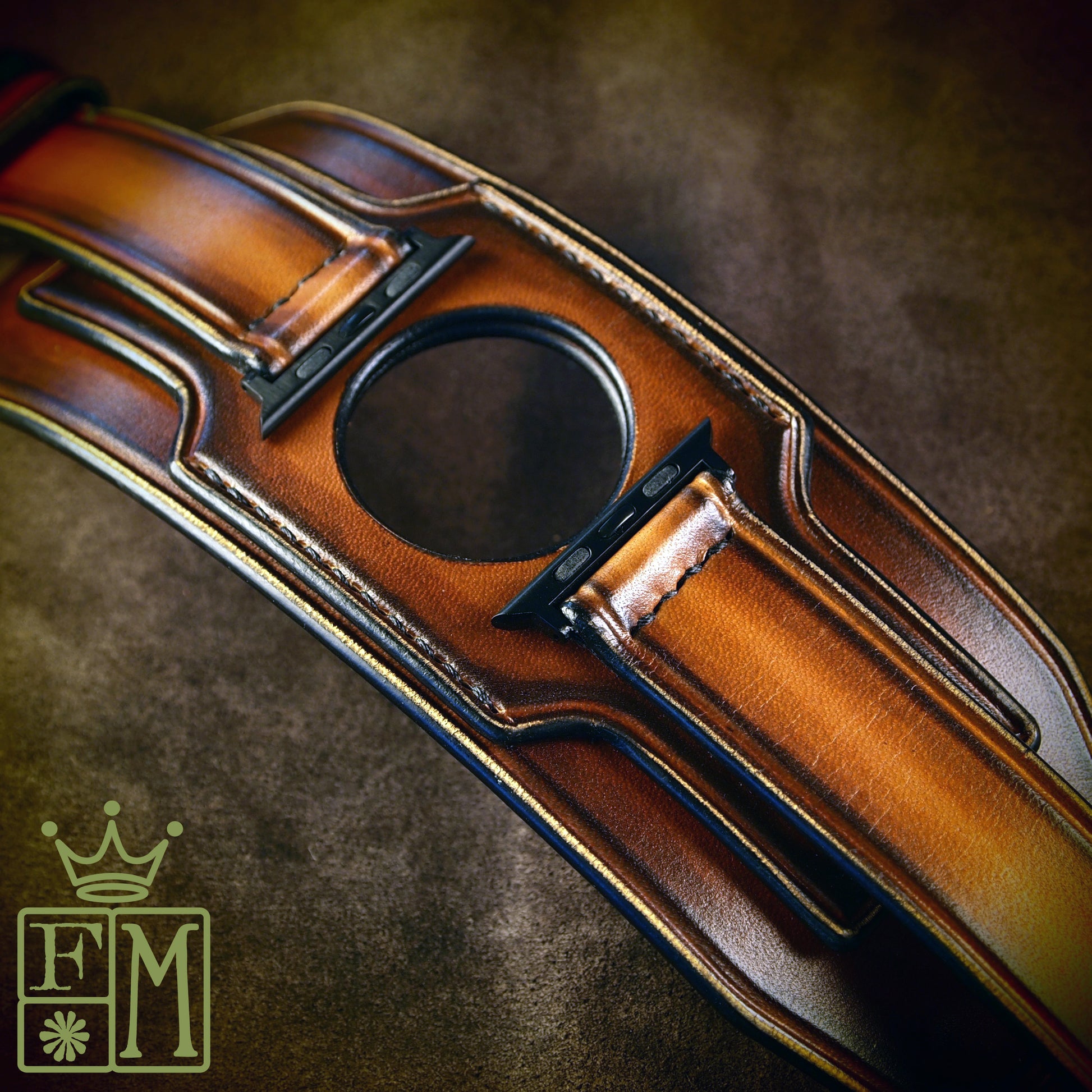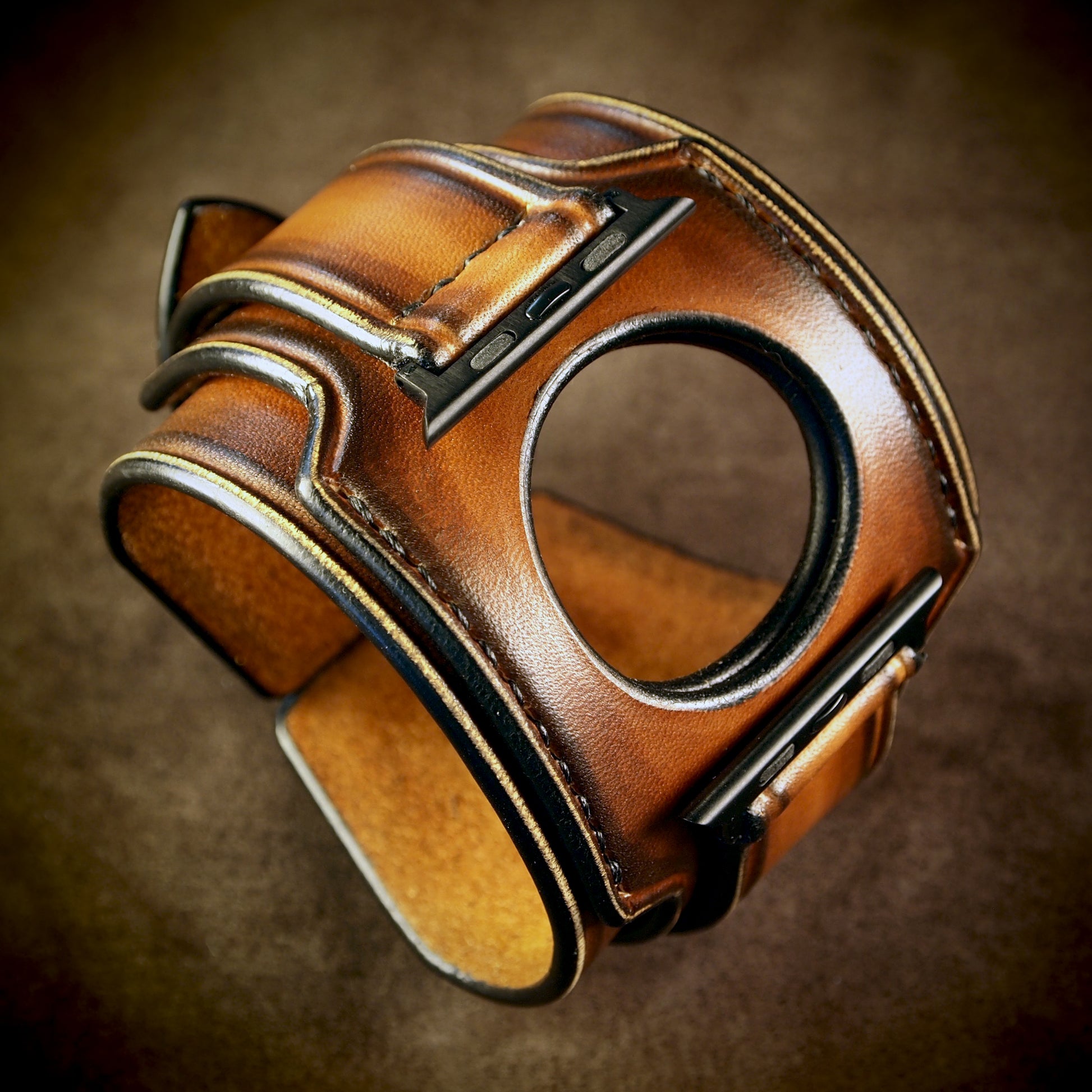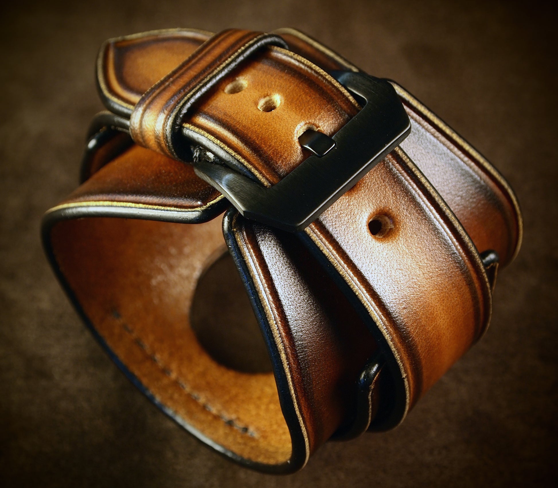This 2-3/8" (6 cm) wide layered watchband is made using natural vegetable-tanned leather from Tuscany and hand dyed a rich sunburst fade!
